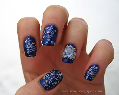 Konad. Całość ozdobiłam białymi kropkami i srebrnymi kuleczkami bulionu.