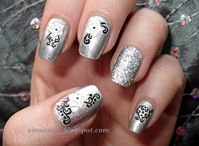 Po nałożeniu bazy czas na lakier Colour Alike Lustrzanka. Piękne i bardzo ozdobne srebro, wystarczy jedna warstwa, dzięki czemu bardzo zyskujemy na czasie. Na jeszcze świeży lakier na paznokciach palca serdecznego nasypałam srebrny, holograficzny brokat. Na to nałożyłam piękne naklejki z alphanailstylist (do kupienia tu). Całość przykryłam topem Poshe, dzięki czemu wszystko szybko wyschło i się utrwaliło.