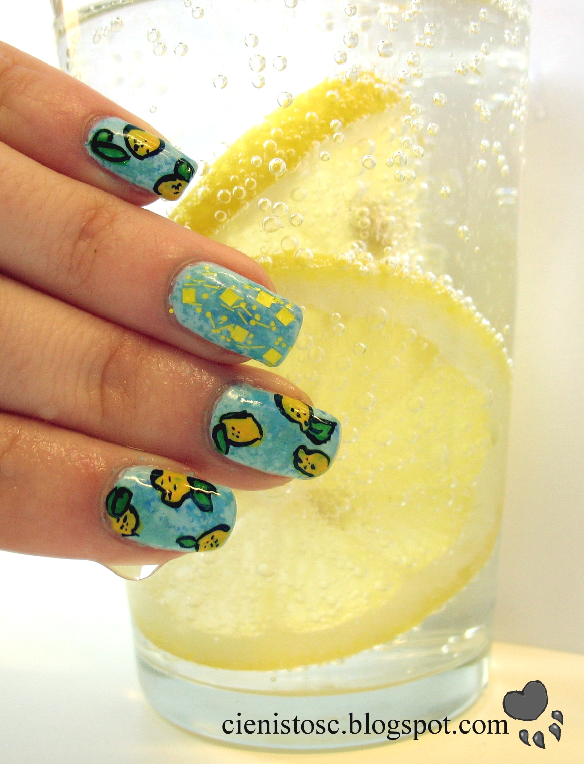 Żółty brokat to Golden Rose Carnival nr 14. Cytrynki malowałam cienkim pędzelkiem i farbkami akrylowymi. Fajny tutorial o