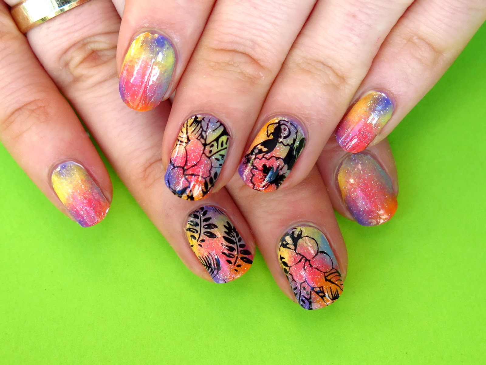 Już robiłam kiedyś podobne zrobienia, ale uwielbiam je – tęczowe, gradientowe tło, holograficzny pyłek i czarne, tropikalne wzory. Kwintesencja wakacji 😀