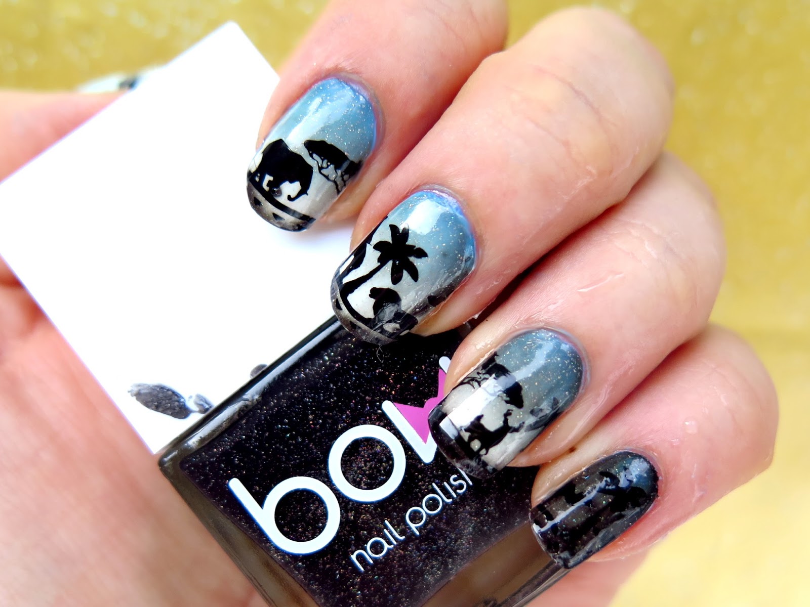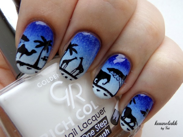 „Twin Mani” z Trii! Wybrałam afrykański wzór, a Trii wybrała kolory. Wyszło pięknie, kojarzy mi się z chłodnym świtem na gorącej sawannie! Do swojej wersji dorzuciłam czarno-przezroczysty termiczny top Bow. Zmiana barwy dodatkowo podkręciła klimat przejścia między ciemną nocą, a świetlistym porankiem. W wersji „zimnej” kontury zwierząt były ledwo widoczne na rozgwieżdżonym holograficznymi drobinkami tle. A w wersji „gorącej” holograficzny brokat podkreślał blask słońca. Trii miała świetny pomysł na kolory!