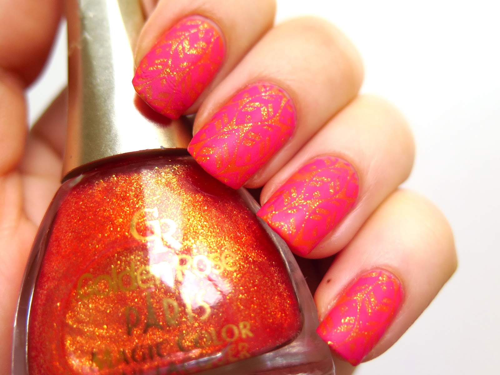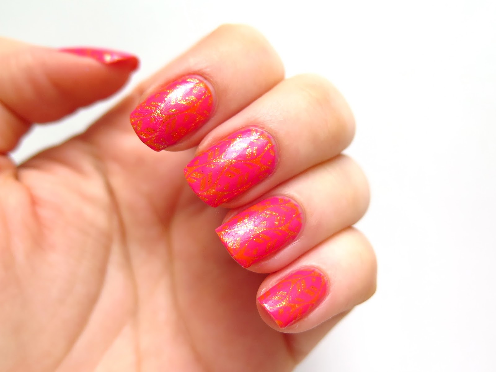 A tu coś bardziej subtelnego. Połączyłam iskrzące, ogniście pomarańczowe tło z różowymi piórkami. Od początku planowałam nosić to zdobienie w matowym wykończeniu, aby podkreślić kontrast między lakierem z drobinkami a kremowym stemplem. Ale tutaj pokazuję obie wersje. Wyszło moim zdaniem bardzo fajnie – pierzasty deseń i grę kolorów widać z bliska, natomiast z daleka barwy się mieszały tworząc piękny, wielowymiarowy koral.