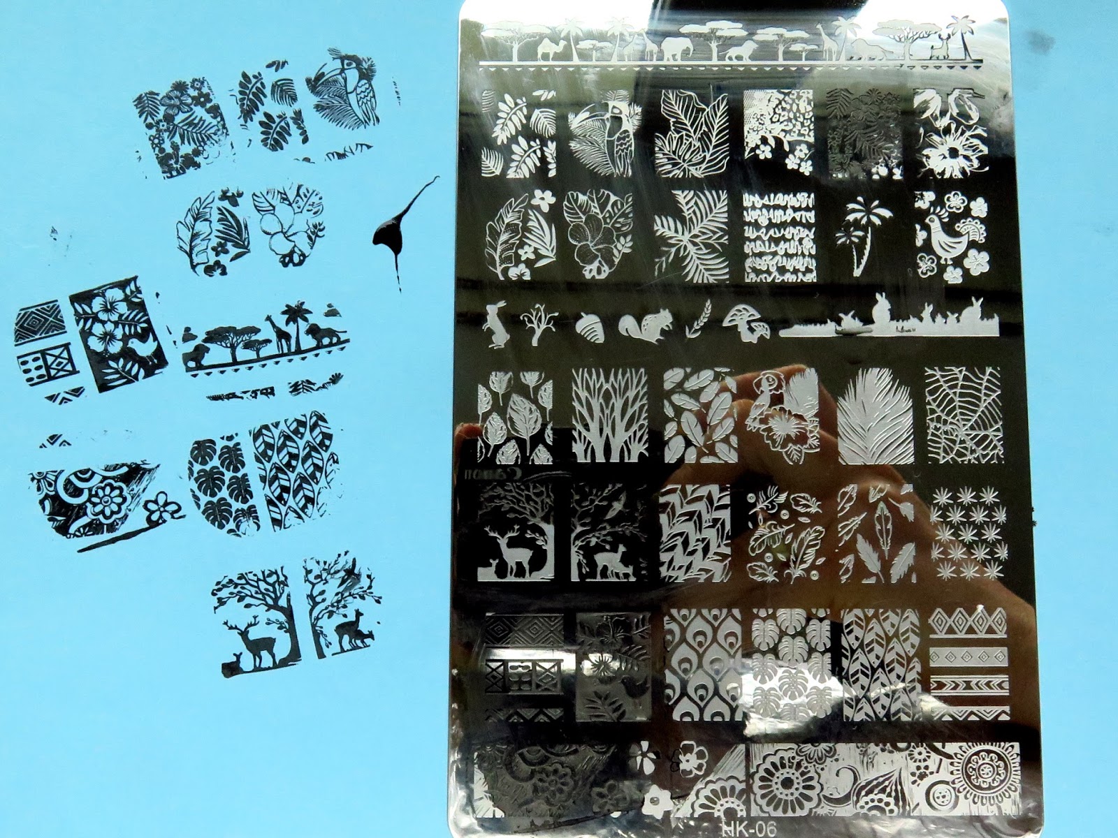 Płytka idealna na wakacje! Tutaj z kolei wzory są niewielkie, zaledwie 15×12 mm. Paznokieć kciuka mam na to minimalnie za duży, ale tak poza tym dla mnie jest ok. Wzory są bardzo różnorodne – afrykańska sawanna z dzikimi zwierzętami, tropikalne kwiaty i ptaki, piórka, motywy folkowe i azteckie, leśne stworzenia. Wszystkie wzorki mi się podobają! Dlatego też zrobiłam więcej zdobień z wykorzystaniem tej płytki niż w przypadku jej poprzedniczki.