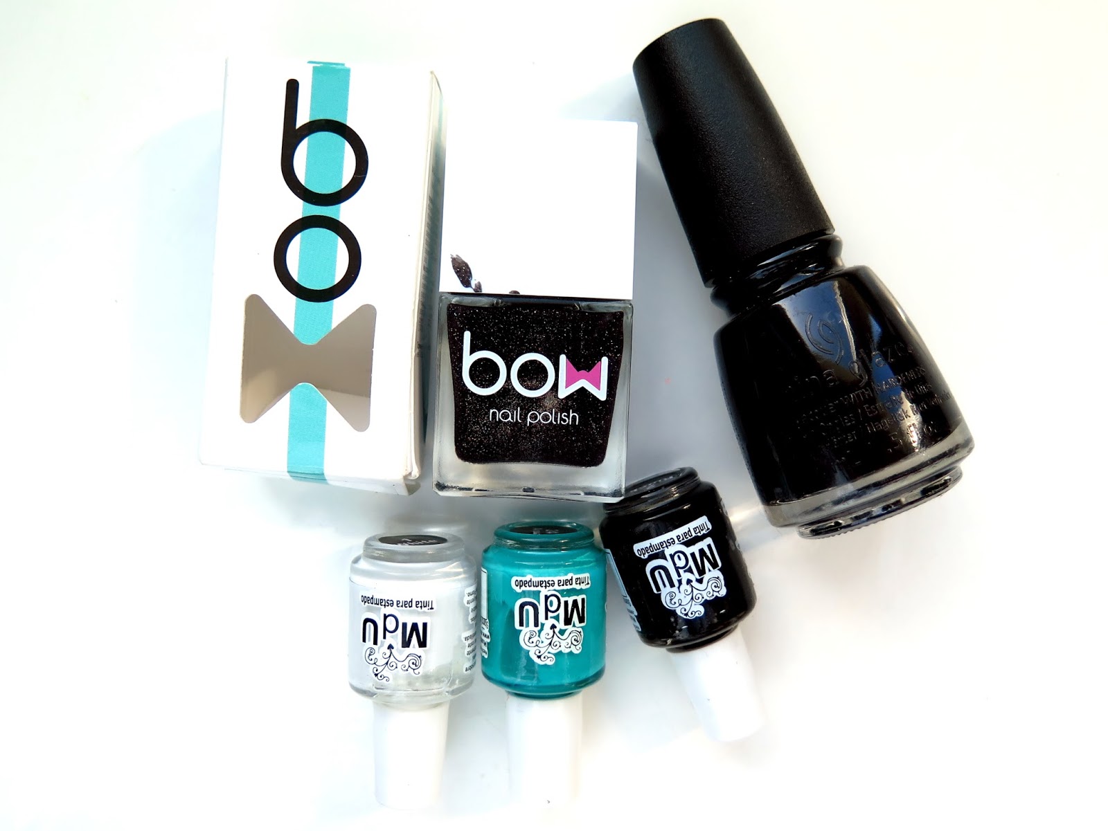 Jest też coś na co bardzo długo czekałam! Niesamowity termiczny topcoat BOW, który zmienia się z przezroczystego na czarny, a do tego ma jeszcze holograficzne drobinki! Zakochałam się w nim, odkąd go zobaczyłam na Instagramie u Svety. Z Martą z RedRouge czatowałyśmy, aż będzie restock w sklepie Nailland i gdy tylko uzupełnili zapasy udałyśmy się na łowy! Thermo topcoat to mój największy łup, ale dokupiłam też parę „drobiazgów”. Kończył mi się klasyczny czarny lakier, czas było już zaopatrzyć się w nowy i na podstawie opinii z Internetu wybrałam China Glaze. Kupiłam też moje pierwsze super lakiery do stempli Mundo de Unas – czarny, biały oraz turkusowy „Aqua”. Wcale nie śmierdzą tak bardzo, jak się słyszy! A stemplują pięknie.