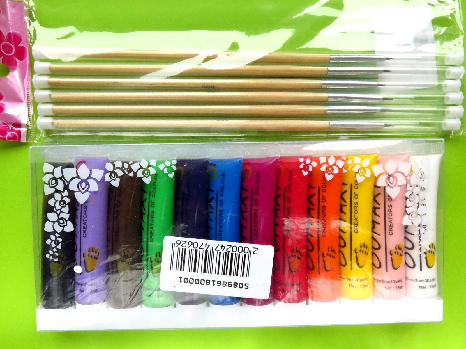 Kupiłam też cały zestaw farbek akrylowych Oumaxi. To miła odmiana, bo jak dotąd miałam tylko te podstawowe kolory i wszystkie pozostałe barwy musiałam mieszać. A teraz mam taki wybór kolorów, że hej! Szczególnie ten jasnofioletowy bardzo mi się podoba. Fajnie też, że jest cielisty różowy i brązowy.