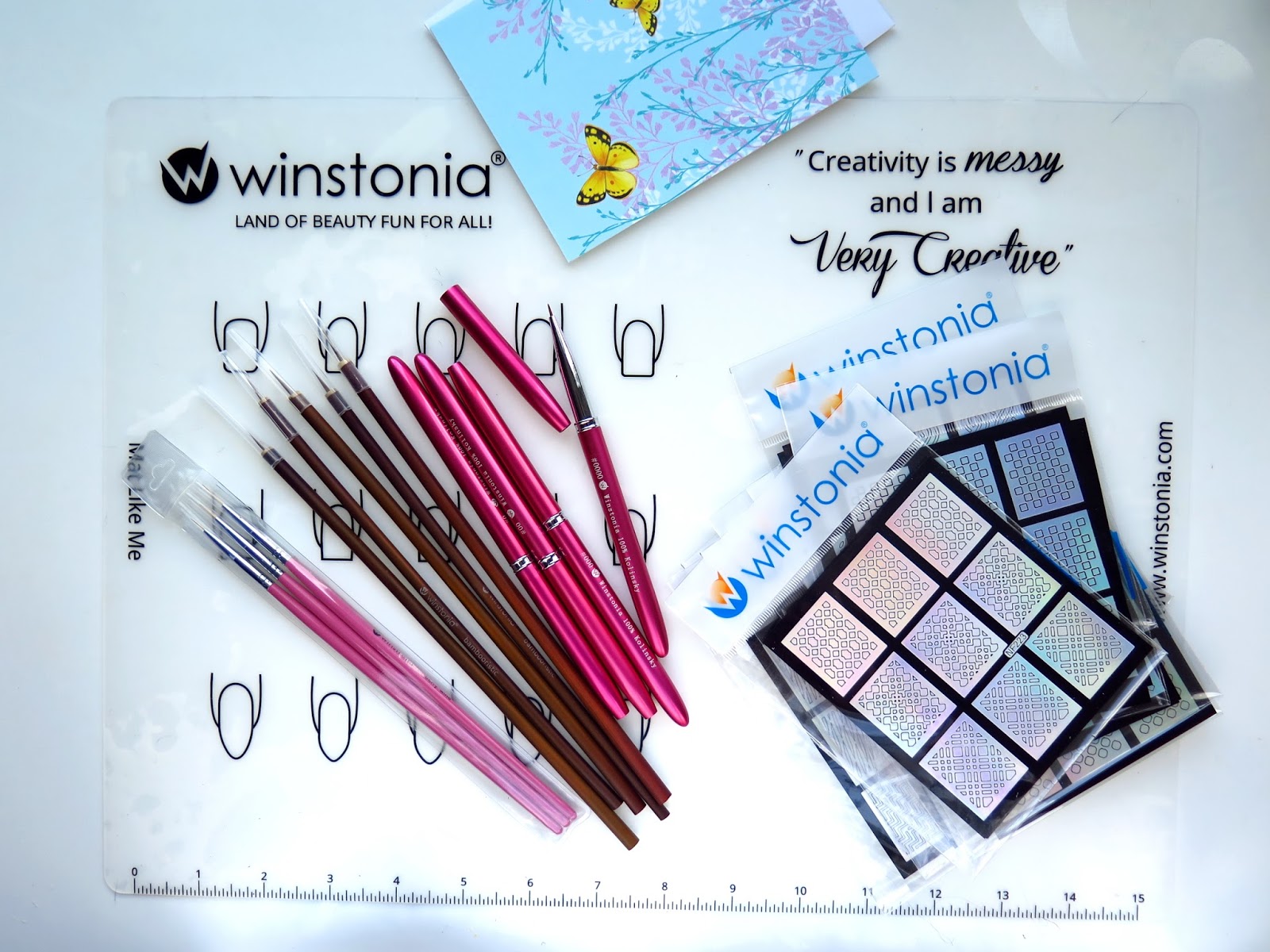 A nagroda od sklepu Winstonia jest turbo szałowa! To silikonowa mata do stempli/naklejek (wreszcie nie mam biurka upaćkanego lakierami!), cały gruby plik szablonów do paznokci (z boskim efektem holo!) oraz zestaw pędzli do zdobień. Całość widzicie na pierwszym zdjęciu tego wpisu. Najbardziej jestem zadowolona z pędzelków. Są super profesjonalne, rewelacyjnej jakości i maluje się nimi wyśmienicie.